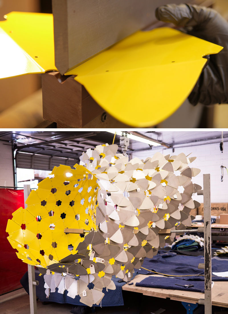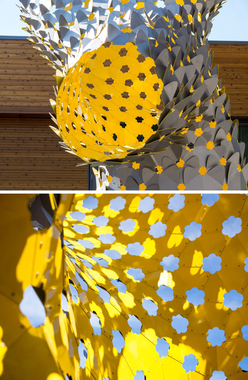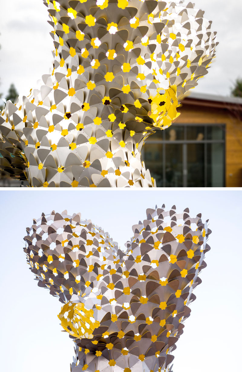 雕塑完全由噴砂不銹鋼制成,內(nèi)部有黃色粉末涂層。