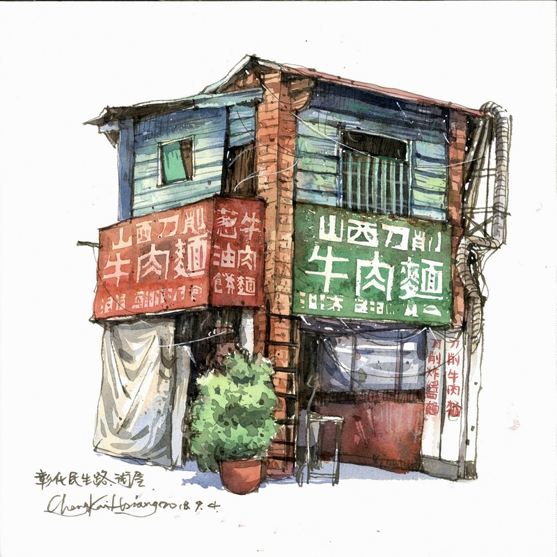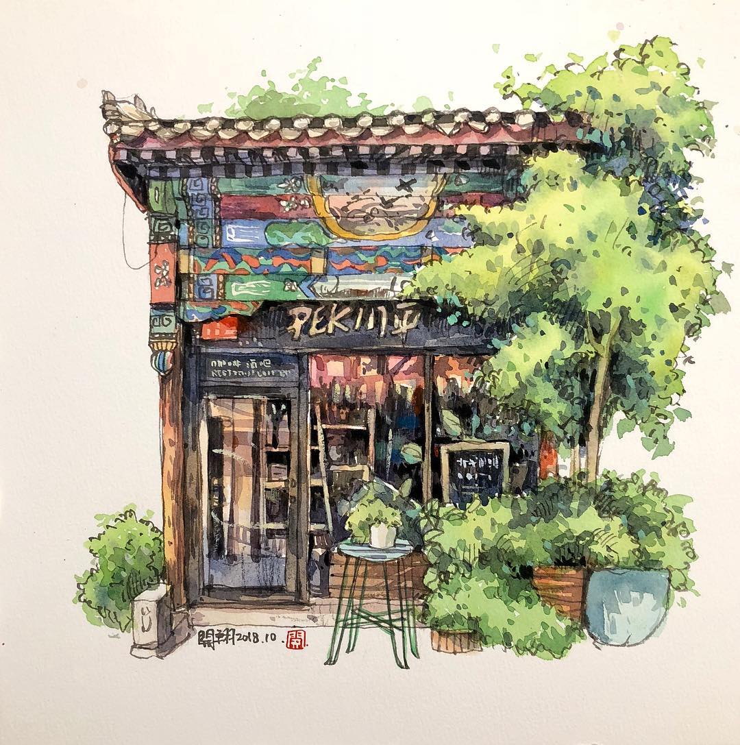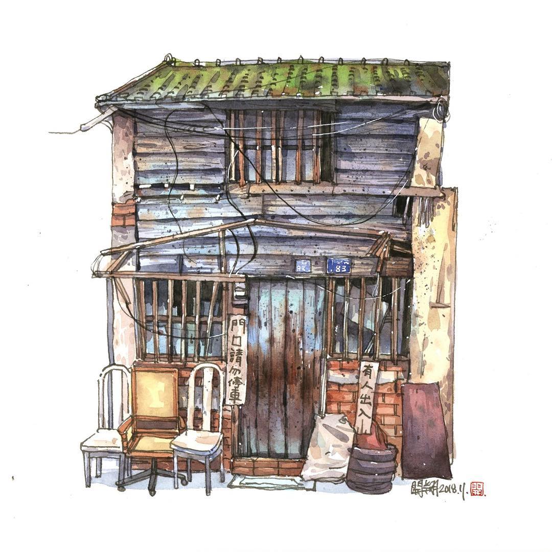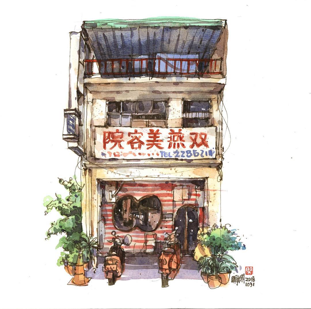 來自臺灣的水彩畫家鄭開翔Cheng Kai-Hsiang)以水彩寫生的方式,記錄旅途中的風(fēng)景。他的作品看上去輕松愜意,他通過畫筆捕捉到許多城市中的角落和局部,有些看似平常的街景在他的描繪下,都變得生動而有趣。