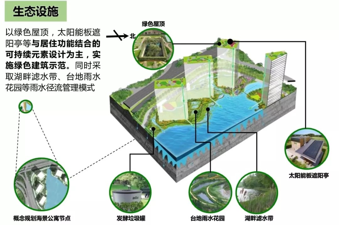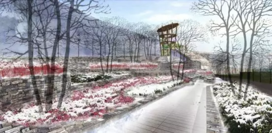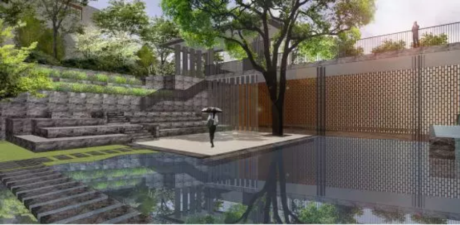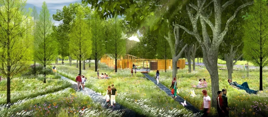 公園通過一系列景觀地形的塑造和LID技術(shù)的運(yùn)用構(gòu)建海綿基底,用雨水花園及生態(tài)排水系 統(tǒng)涵養(yǎng)水源,基地自北向南對(duì)雨洪管理進(jìn)行設(shè)計(jì),雨水徑流,旱溪,下凹雨水花園,預(yù)制 模塊存水設(shè)備層層截流,使該區(qū)域功能上起到旱時(shí)補(bǔ)水,澇時(shí)排水的作用。