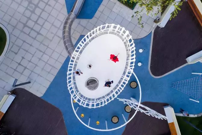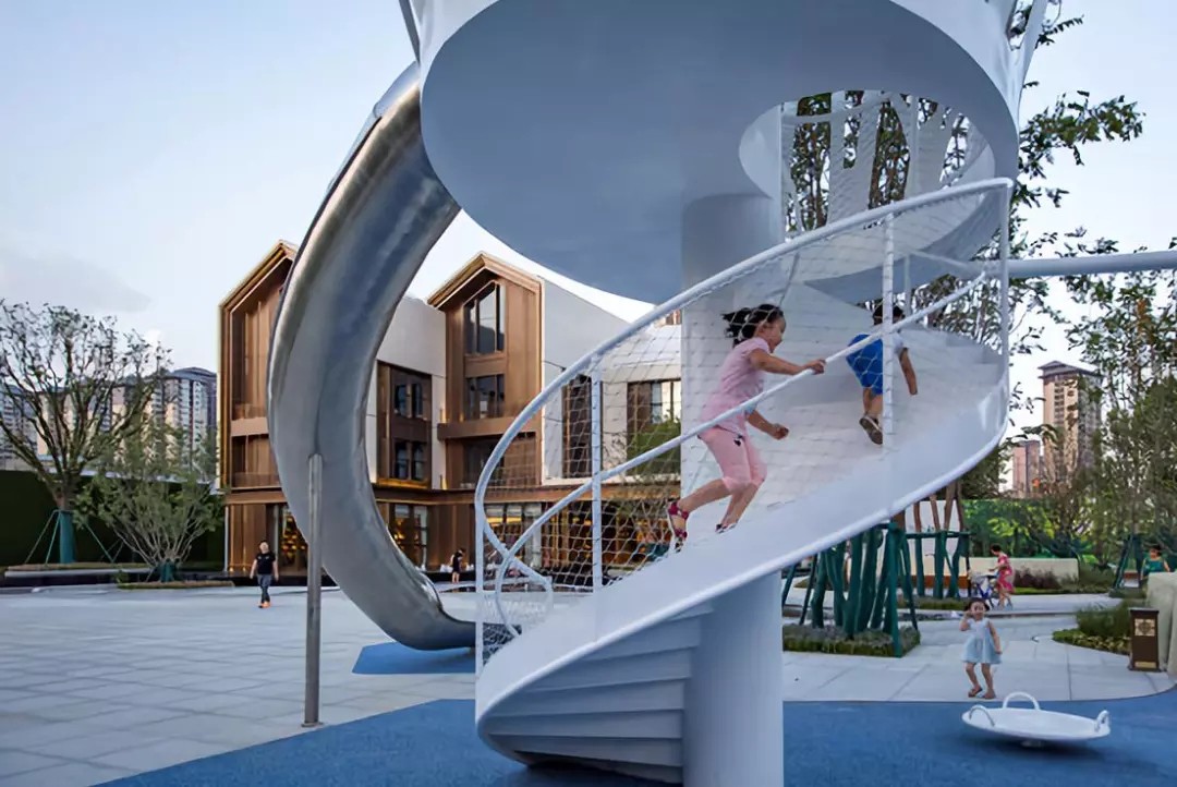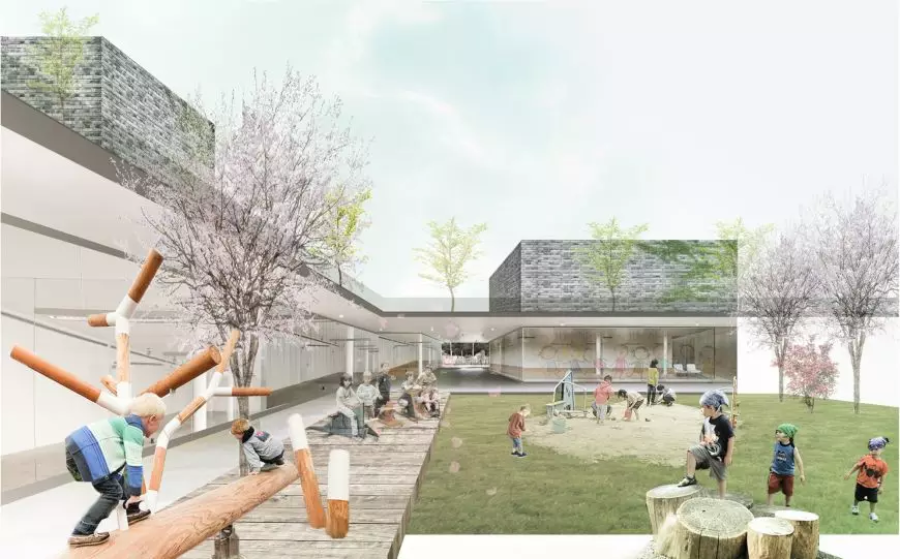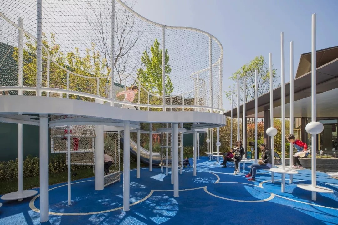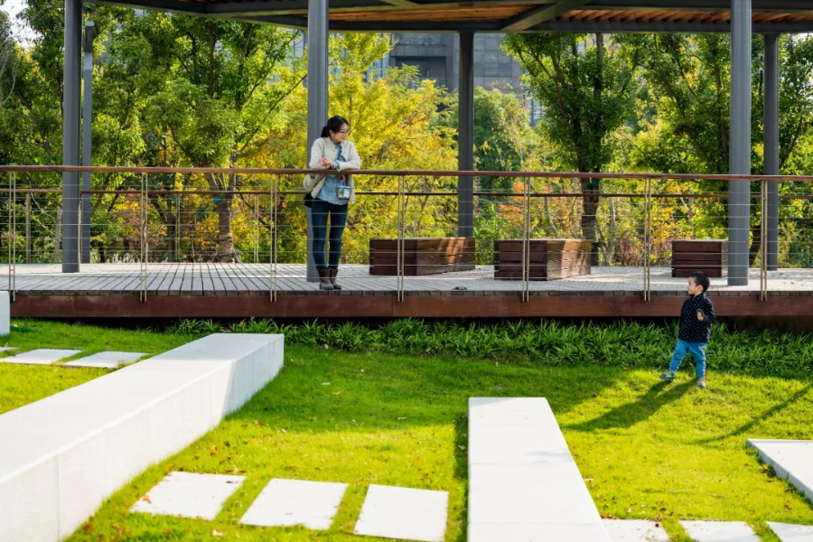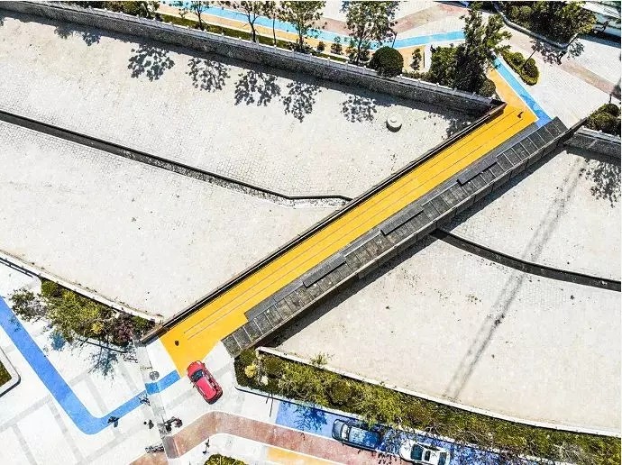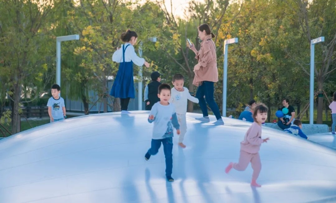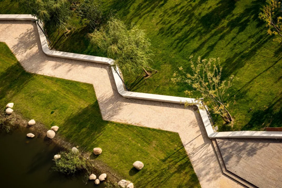 對(duì)原始場(chǎng)地進(jìn)行整理打造更親民的活力空間 ,用簡(jiǎn)潔的設(shè)計(jì)語言將地形與覆土建筑相結(jié)合,營(yíng)造景觀新生機(jī) 。運(yùn)用幾何語言強(qiáng)調(diào)構(gòu)筑物與環(huán)境的對(duì)話,增強(qiáng)使用者的體驗(yàn)感與舒適性 。借助地形處理,豐富景觀層次,通過對(duì)兒童空間的尺度,材料,趣味性等元素的研究營(yíng)建受兒 童歡迎的戶外活動(dòng)空間
