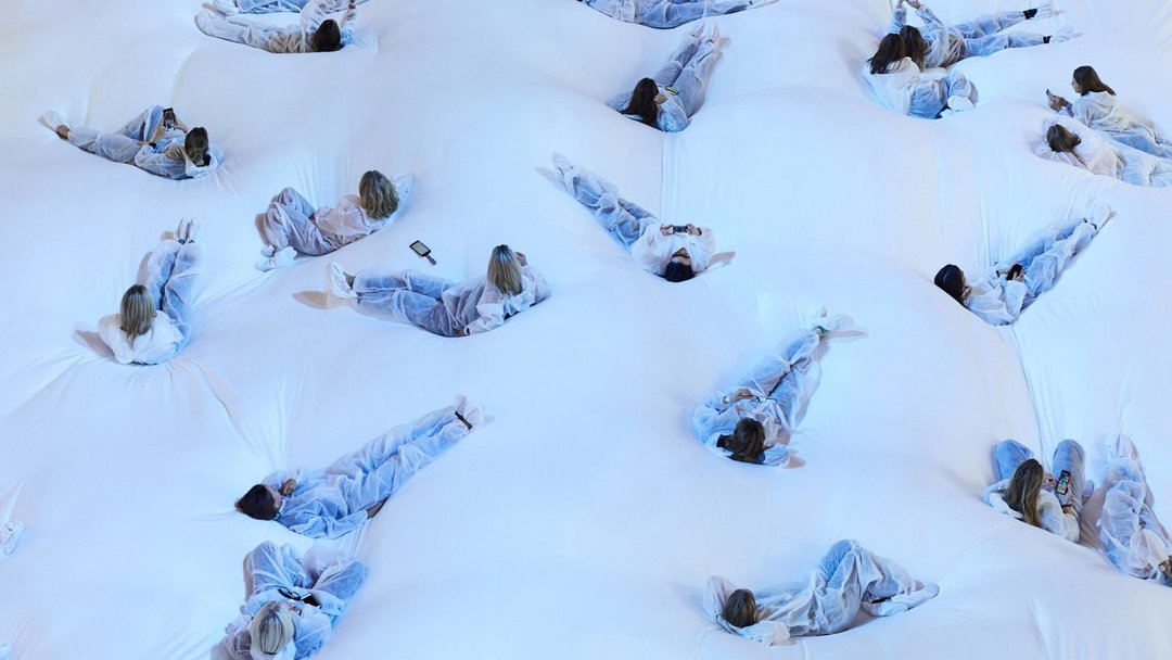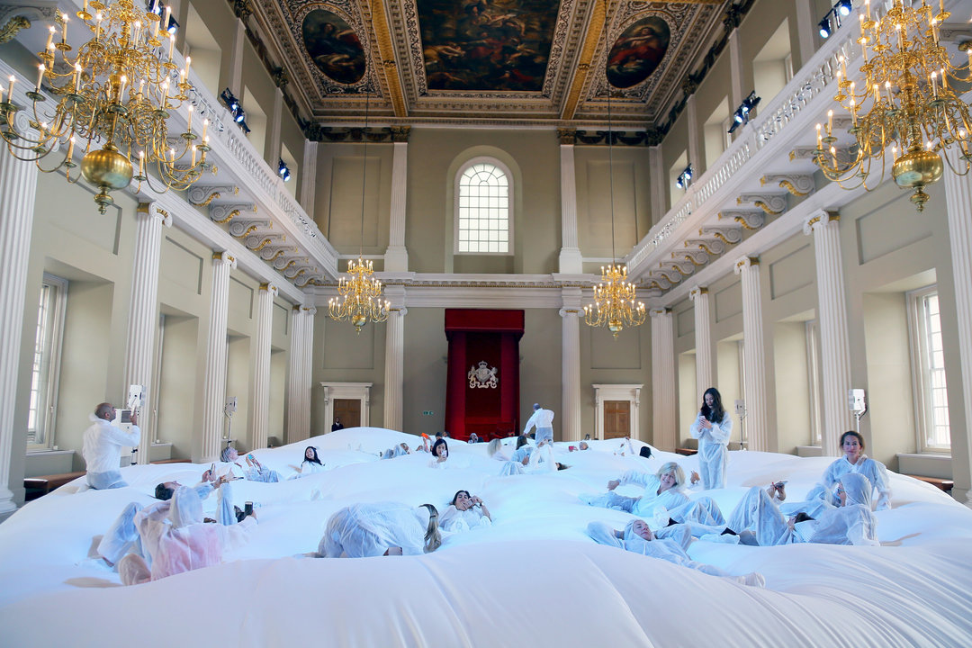 進入廳內(nèi)的參觀者被要求穿上白色防塵外衣,然后便能爬上這個巨大的柔軟沙袋。天花板上是一幅由 16 世紀弗蘭德畫家 Peter Paul Rubens 創(chuàng)作的唯一天花板畫作。