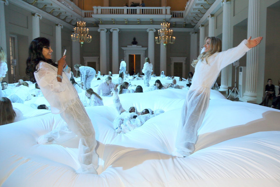 2018 年,Hindmarch 曾為該時裝周設(shè)計了一款“世界上最大的豆袋”,能容納 90 人,放置于位于倫敦白廳街國宴廳(Banqueting House),為其 3 天。該建筑是英國建筑史上第一座古典主義建筑,始建于 1619 年。