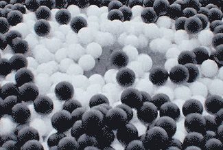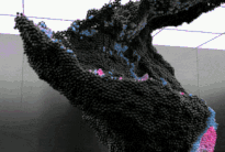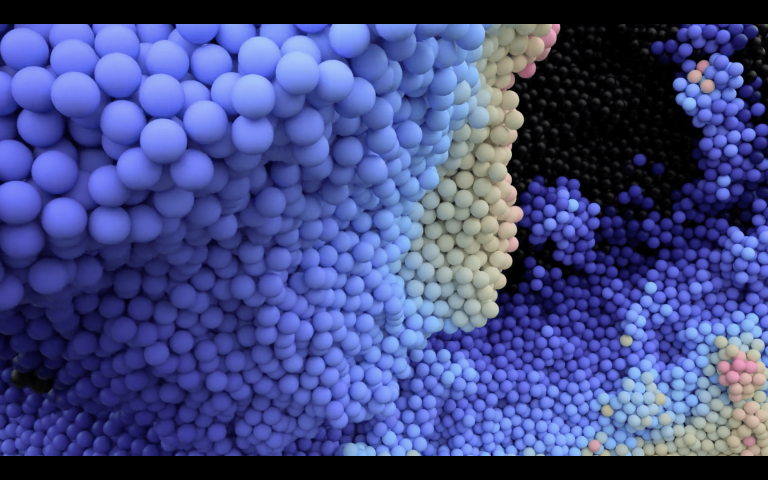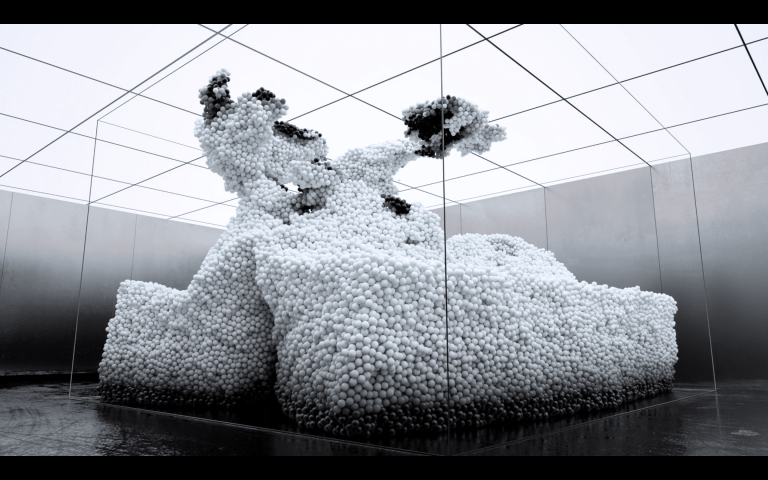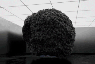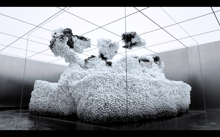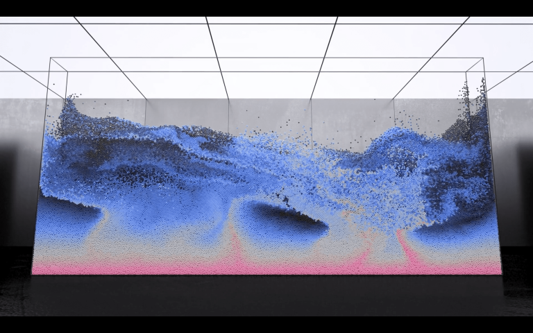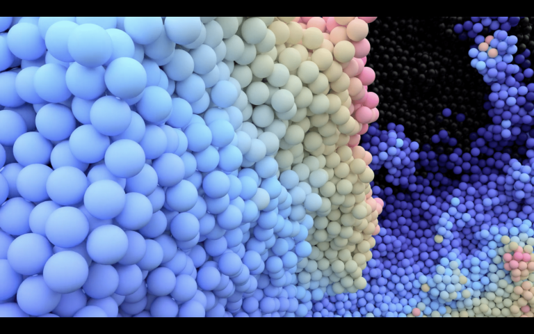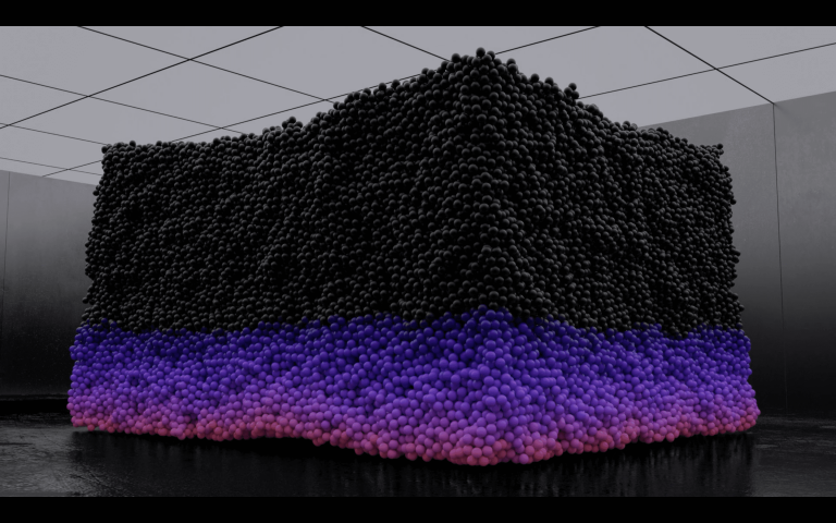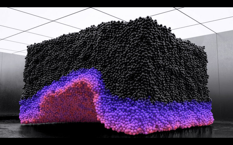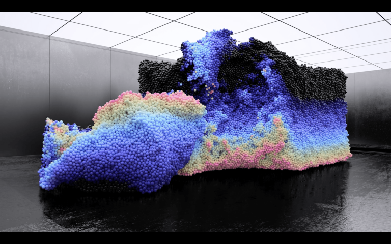 在這幅畫中,一波閃亮的黑色小球在泡泡糖藍(lán)色和粉色的爆發(fā)中迅速改變顏色,然后隨著質(zhì)量的下降