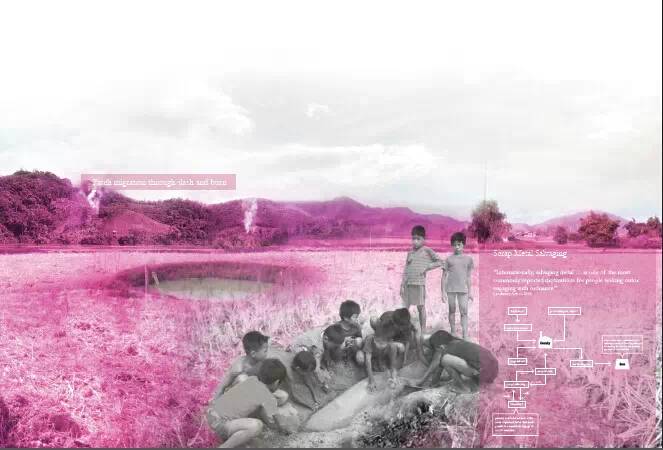 在過(guò)去的二十幾年間,沒(méi)有任何人來(lái)推動(dòng)這一區(qū)域的排雷,而在最近的幾年由于發(fā)現(xiàn)這一地區(qū)擁有大量的金礦,因此國(guó)際采礦組織開(kāi)始從容地大量進(jìn)入老撾,他們用野蠻的方式進(jìn)行著探礦,他們挖掘道路,為之后的探礦與采礦進(jìn)行準(zhǔn)備。在老撾所建造的戰(zhàn)后景觀,以及對(duì)于當(dāng)?shù)厮a(chǎn)生的新的探礦的熱潮的了解,使我重新來(lái)思考采礦與排雷兩種人類對(duì)景觀造成最為深遠(yuǎn)影響的行為。我所選擇的這個(gè)研究場(chǎng)地被當(dāng)?shù)厝朔Q作金子的山谷,遠(yuǎn)在國(guó)際探礦組織進(jìn)駐老撾之前,當(dāng)?shù)氐娜藗兙烷_(kāi)始通過(guò)淘沙等手段進(jìn)行小規(guī)模的金礦開(kāi)采。