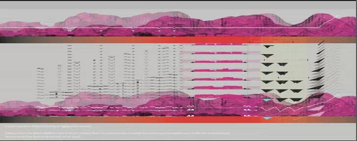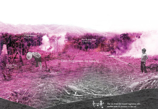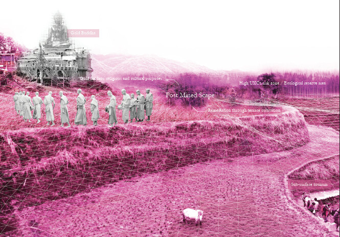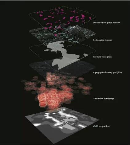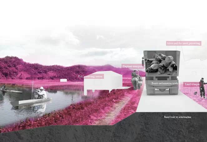 通過(guò)利用現(xiàn)有的農(nóng)耕燒荒系統(tǒng),通過(guò)利用這些無(wú)植被的地塊來(lái)將采礦與排雷系統(tǒng),融入現(xiàn)有的農(nóng)業(yè)耕作周期之中,以此來(lái)達(dá)到對(duì)土地的循環(huán)利用,從而減小對(duì)一個(gè)區(qū)域生態(tài)系統(tǒng)的威脅。同時(shí)采礦也擁有了多周期的一個(gè)復(fù)墾周期,使它能在后采礦景觀中得到重生。戰(zhàn)爭(zhēng)期間基礎(chǔ)設(shè)施受到破壞,而這個(gè)項(xiàng)目中三者的一個(gè)結(jié)合,可以成為老撾重新構(gòu)建基礎(chǔ)設(shè)施的基礎(chǔ)。在我的項(xiàng)目之中,采礦公司我將它看作景觀設(shè)計(jì)師,在戰(zhàn)爭(zhēng)中所留存的8000余萬(wàn)枚未爆炸的炸彈,成為重新思考老撾采礦的契機(jī)。而采礦本身的挖掘與開(kāi)采過(guò)程,也成為重新塑造這片土地的基礎(chǔ),采礦操作成為挖掘與重建并存的機(jī)制。在我的項(xiàng)目中,我將景觀之上看似毫無(wú)相關(guān)的一些元素進(jìn)行重組,使它們能夠形成互利共生的機(jī)制,從而轉(zhuǎn)變老撾的戰(zhàn)后景觀。