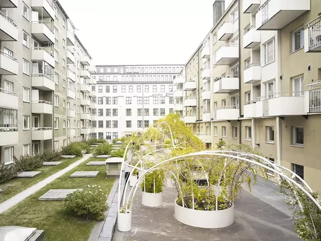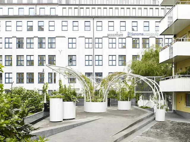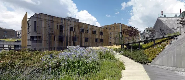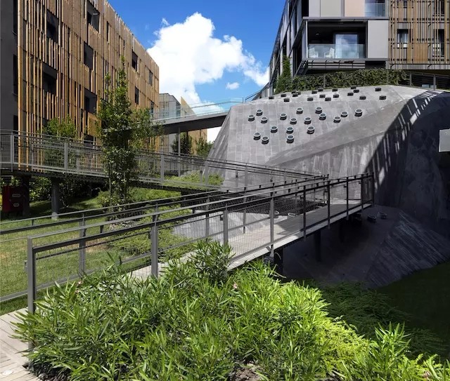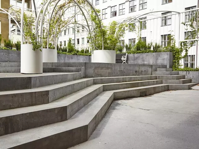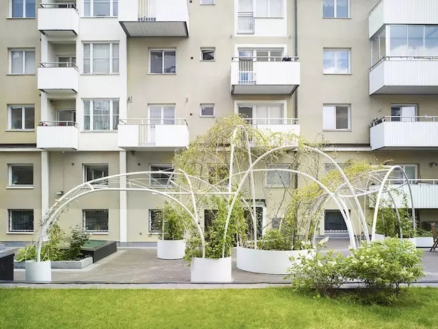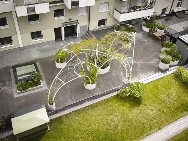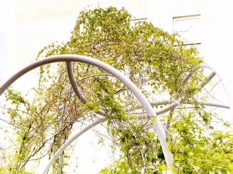 這是一處特殊的區(qū)域,幾幢樓之間帶有天窗的裙房屋頂空間要被辟為休閑綠地。因為承重和造價原因,場地不適合種植高大喬木,于是設計團隊 GUISE 利用能攀緣植物的拱形棚架完美解決了這一問題。