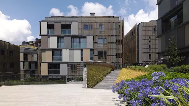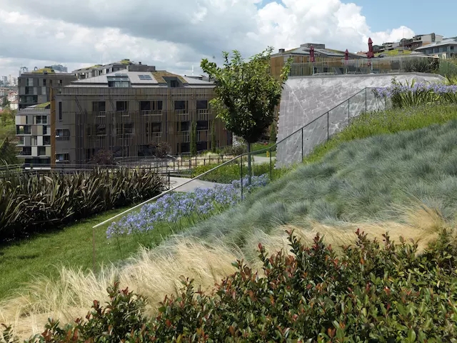 和常規(guī)意義上的屋頂花園不同,Ulus Savoy 住宅區(qū)的自然景觀是從社區(qū)內(nèi)的路面延伸至各個坡路和住宅塔樓的頂部。