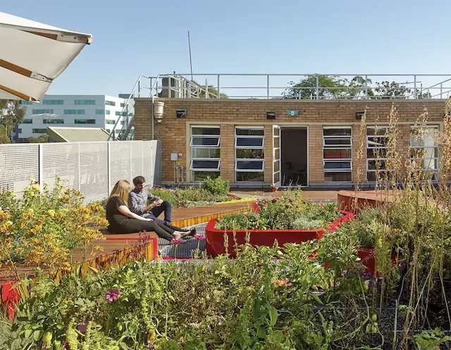 設計團隊在屋頂東南角的混合種植花床上設計了開場的混合草坪,是聚會或者是集體活動的理想場所。