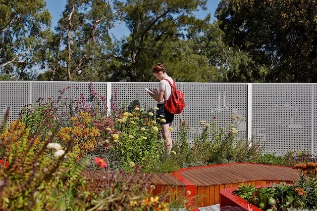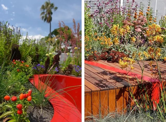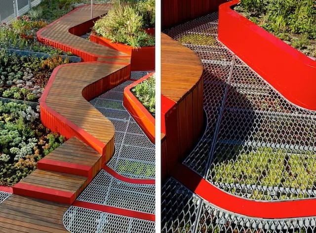 多樣化的植物種植區(qū)有灌溉區(qū)和非灌溉區(qū);倒圓角的木質桌椅和道路分劃出各個小的植物群。三條紅色的條帶穿越木質平臺,形成各自的平面微區(qū)域,并與中心紅色植物種植槽形成呼應。屋頂花園的植物采用墨爾本本土植物,同時也創(chuàng)造出鳥類、昆蟲和爬行動物的棲息地。
