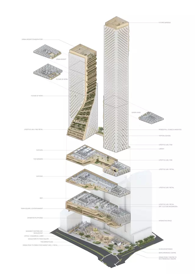 除了傳統(tǒng)的公寓住宅和酒店,下部樓層還包含了包括零售空間、學(xué)校、日托中心、圖書館、電影院,加上位于屋頂公共花園,一座城市的格局在其中豎向拉開。