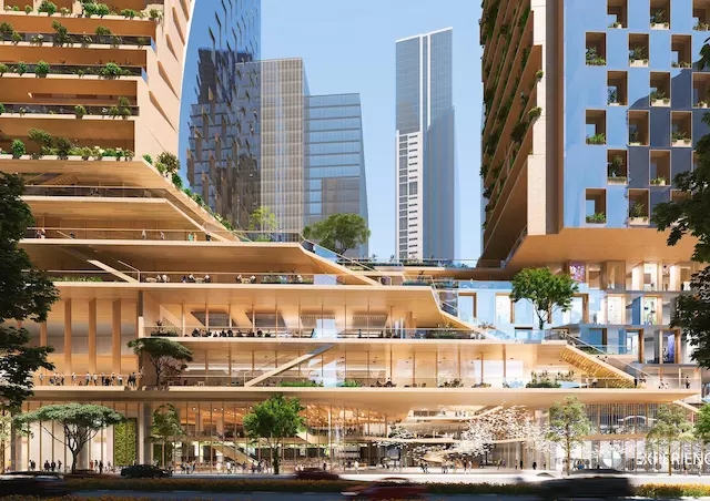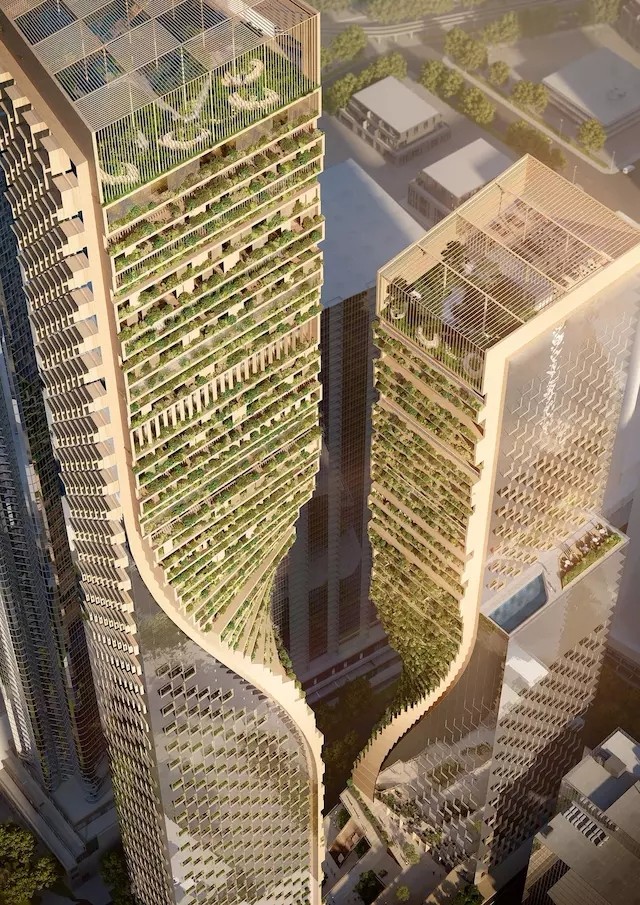 最終,一組被稱為“ Green Spine ”(綠色脊柱)的雙塔在六個候選方案中勝出。塔樓的外形有些類似扭旋的 DNA 鏈,一側(cè)是像素感的玻璃幕墻,一側(cè)是一直延伸到樓頂?shù)碾A梯狀灌木表面——這種巴比倫空中花園式的設(shè)計正在全球范圍內(nèi)變得流行, Stefano Boeri 著名的“垂直森林”和胡志明市的“天空森林”中都可以見到它的影子。