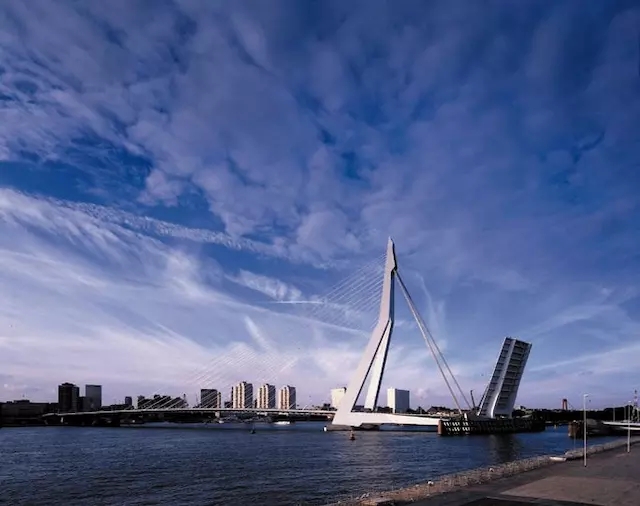 工作室最早,也是最負(fù)盛名的設(shè)計之一是橫跨馬斯河的一架地標(biāo)性的天藍(lán)色橋梁,連接了鹿特丹市南北部的伊拉斯謨橋。這座價值 3.42 億美元的大橋建于 1996 年,由于不對稱的優(yōu)雅結(jié)構(gòu)被當(dāng)?shù)厝朔Q為“天鵝”。