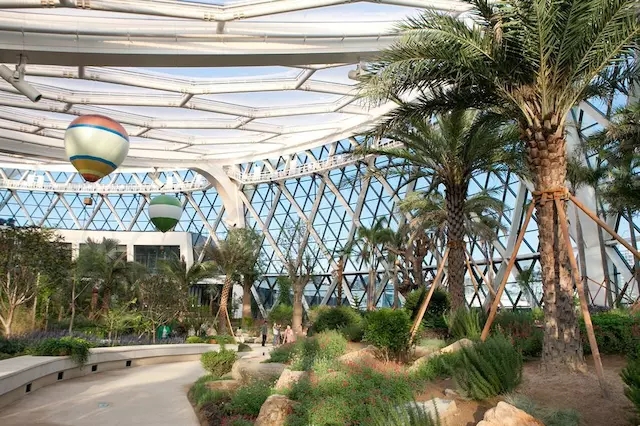 Chanjoong Kim 將這個溫室設(shè)計為“中間低兩邊高”的形式,與傳統(tǒng)設(shè)計形成對比,從而擴展用戶體驗。扁平玻璃屋頂使用了特殊的 ETFE 玻璃材料,帶來良好的透光性,其輕質(zhì)面料能夠減少空氣中的二氧化碳排放。在建筑內(nèi)部,一條空中步道橫跨花園的上層天篷,允許游客從多個角度觀賞奇異的植物,同時還有一些小型熱氣球漂浮在空中。