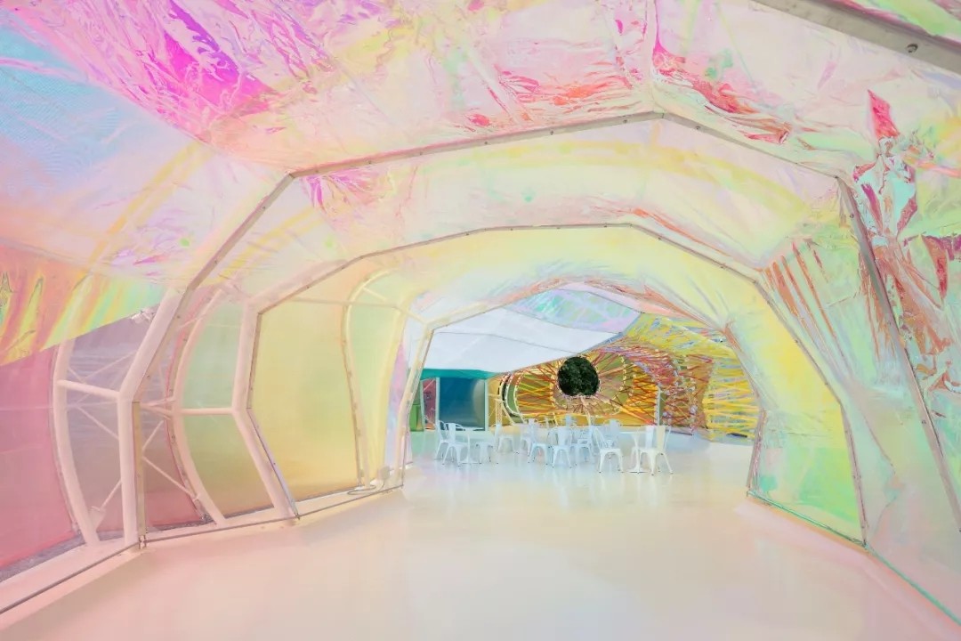 這對建筑師為畫廊設(shè)想了一個由交織的半透明或多顏色ETFE(乙烯-四氟乙烯共聚物(Ethylene-Tetra-Fluoro-Ethylene)所組成的多重?zé)o固定形狀的多面體結(jié)構(gòu)。它的形態(tài)就好像是為人的大小設(shè)計的貓咪管道玩具,其結(jié)構(gòu)有著多個出入口,也同時擁有著不同種的連廊。這次的設(shè)計最大限度地考慮了參觀者體驗,因此這對建筑師決定建造一個擁有著最簡單、基礎(chǔ)的架構(gòu)以打造不一樣的體驗,因此人們可以感受到結(jié)構(gòu)、光線、透明度、陰影、變換和驚喜。