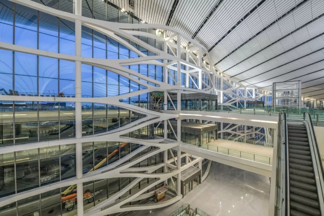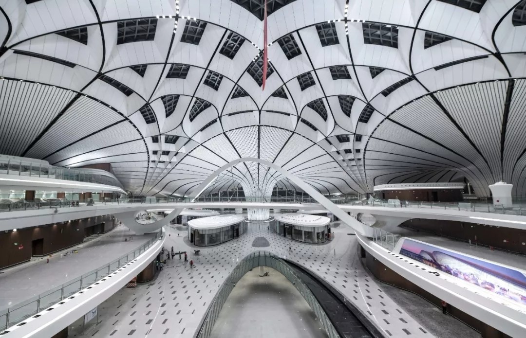 大興機場室內(nèi)大氣磅礴,空間的連通性很強。機場室內(nèi)色調(diào)以白色為主,撐起如荷葉般的結(jié)構(gòu),覆蓋了主要的空間。