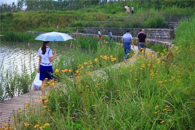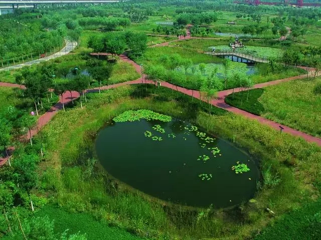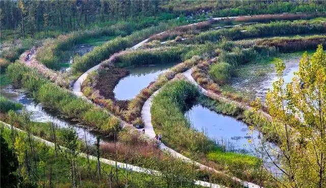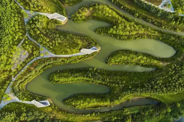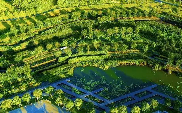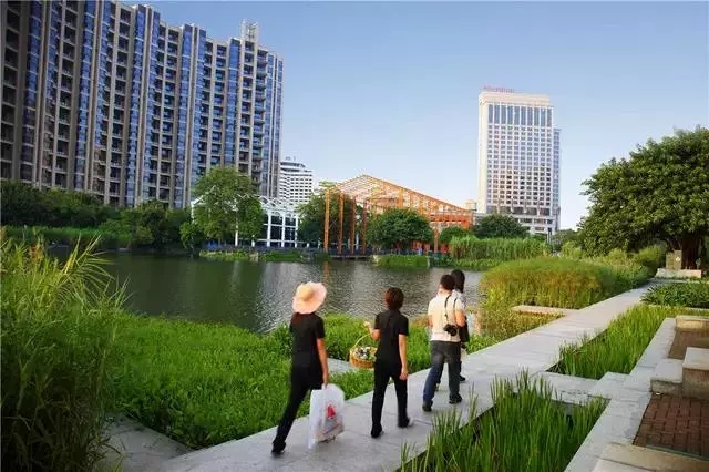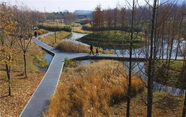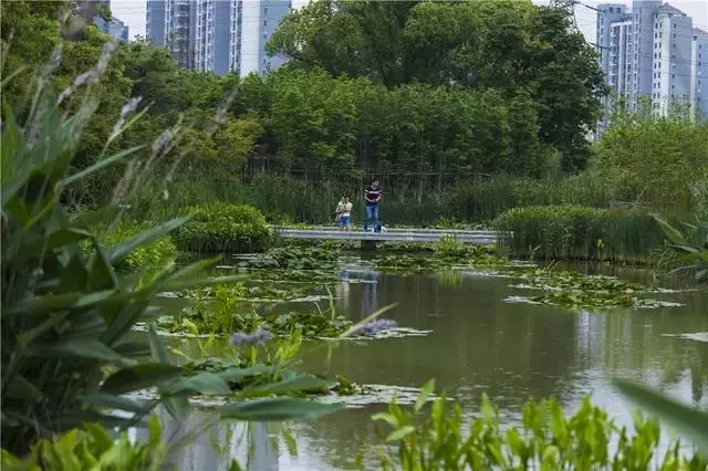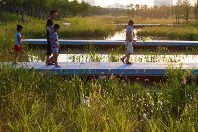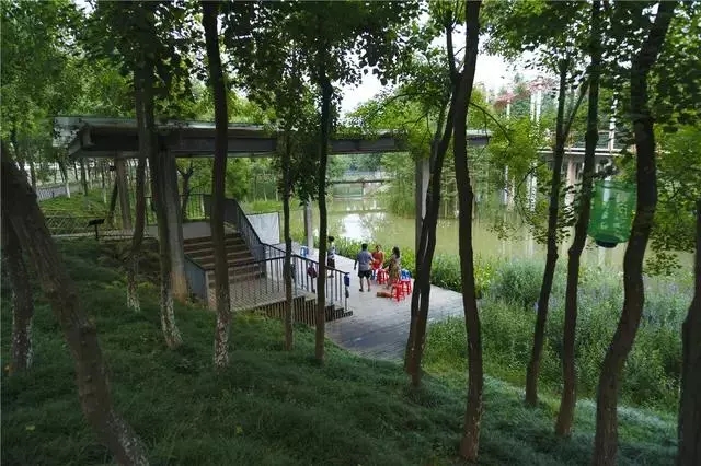 經(jīng)過巧妙的設(shè)計(jì),使魚塘成為水體凈化器,并引入林叢、棧道、廊橋和亭臺(tái), 通過最少的干預(yù),使之成為新城的“生態(tài)海綿”,凈化被污染的運(yùn)河的水體、緩解城市內(nèi)澇,保留場(chǎng)地記憶,同時(shí)為周邊居民提供了別具特色的休憩空間。