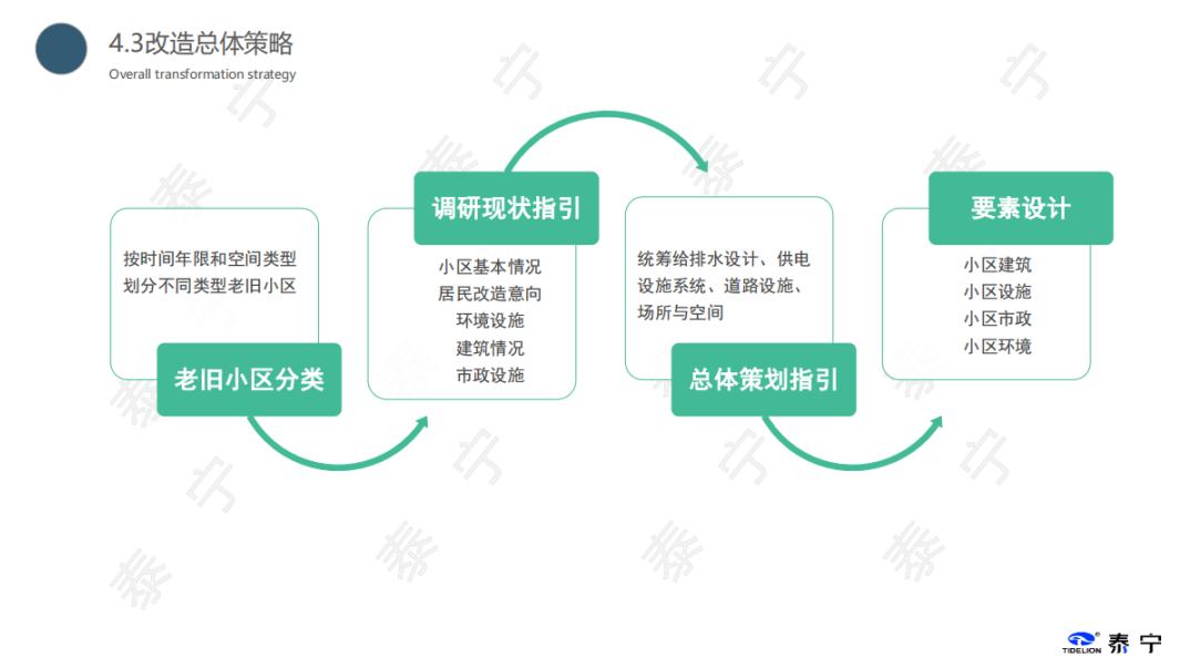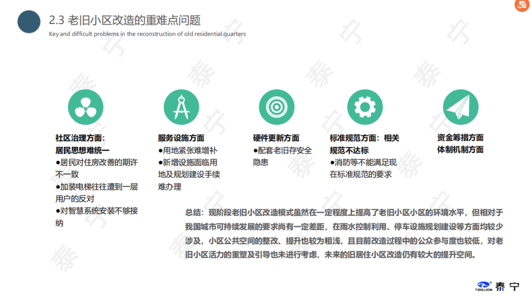在梳理清楚政策背景后,高俊斌分析了老舊小區(qū)改造的現狀問題及難點,以建筑安全與健康欠缺、管網排水能力不足、停車位混亂與綠化有待提升等問題最為要緊。在調查中,他和團隊廣泛采用了民意調查反映,得到了居民最關心的是管網破舊、公共服務缺失和物業(yè)管理缺少這幾點反饋。最后,他將改造重難點歸納為社區(qū)治理提升、服務設施和硬件更新、標準規(guī)范到位和資金籌措欠缺與體制機制僵化幾個方面。