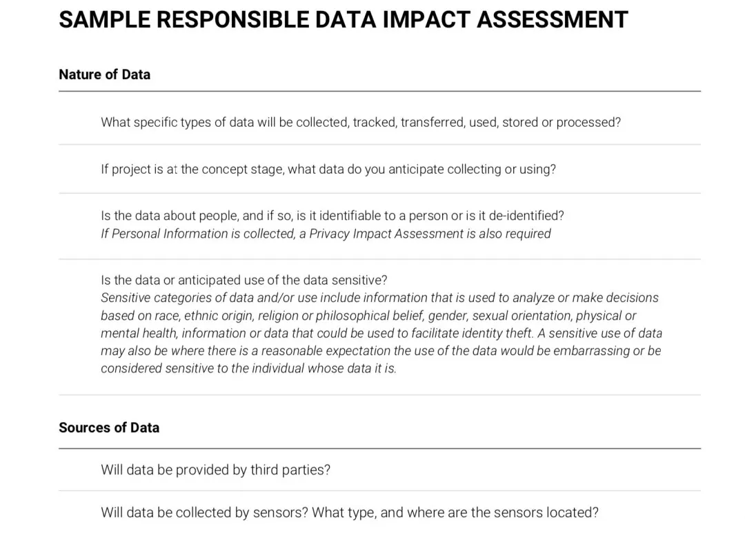 - 數(shù)據(jù)監(jiān)督:數(shù)據(jù)使用責(zé)任評(píng)估 (Responsible Data Use Assessment),所有數(shù)據(jù)在收集前,需要對(duì)數(shù)據(jù)內(nèi)容與影響進(jìn)行評(píng)估,以保證監(jiān)督機(jī)制公開透明。