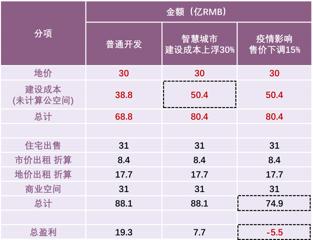 關(guān)于Quayside項(xiàng)目是否能夠盈利,我們這里做了一個(gè)最粗淺的測(cè)算,事先聲明,我們的測(cè)算并不專業(yè),僅僅是近似計(jì)算以評(píng)定智慧城市額外成本和疫情影響將會(huì)多大程度影響項(xiàng)目的盈利狀況。
