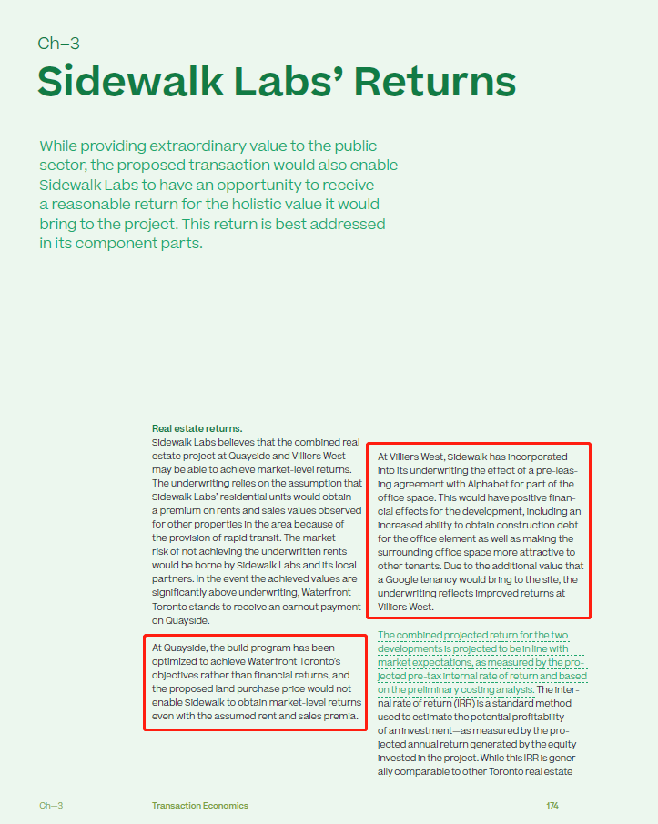Sidewalk 的意思是他們做 Quayside 項(xiàng)目完全無(wú)法盈利,只有通過捆綁 Quayside 和 IDEA 區(qū)的 Villiers West 兩個(gè)項(xiàng)目才能讓其獲得正常水平的投資回報(bào)。事實(shí)是否如此我們無(wú)從知曉,我們也理解在這樣的條件下,商業(yè)公司一定會(huì)低報(bào)自己的盈利可能來(lái)獲得更好的談判籌碼。