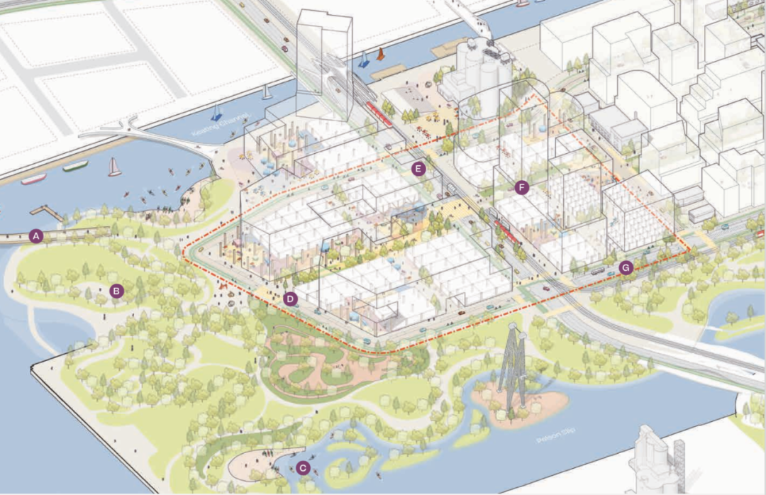 身披科技創(chuàng)新者與城市開發(fā)商雙重光環(huán)的 Sidewalk ,野心十足,旨在把多倫多濱湖地區(qū)打造為智慧城市的典范。除去噱頭十足的大數(shù)據(jù)與人工智能技術(shù),Sidewalk 對(duì)更大尺度的空間規(guī)劃與地產(chǎn)開發(fā)表露出極高的興趣。2019年6月,在其引起巨大爭(zhēng)議的《總體創(chuàng)新與發(fā)展計(jì)劃(MIDP)》中,Sidewalk 突破了 Quayside 的12英畝規(guī)劃范圍,劃定了一片近200英畝的規(guī)劃范圍,其中包括了一片 West Villiers 島上,面積18英畝,擬用做谷歌總部園區(qū)的創(chuàng)新設(shè)計(jì)與經(jīng)濟(jì)開發(fā)區(qū)(IDEA)。