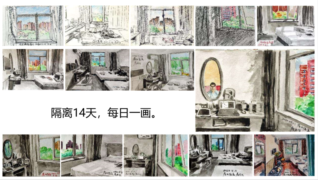 房木生首先提出人類行為會對時空產(chǎn)生影響,因此設(shè)計應(yīng)當(dāng)充分利用場地的特性,獨特與共生共存。在疫情隔離期間,房木生創(chuàng)作了一系列藝術(shù)而富有趣味的向經(jīng)典畫著致敬的自拍作品,還包括自己每天變化的記錄,房間和窗外風(fēng)景的手繪,引發(fā)了大家的共鳴。