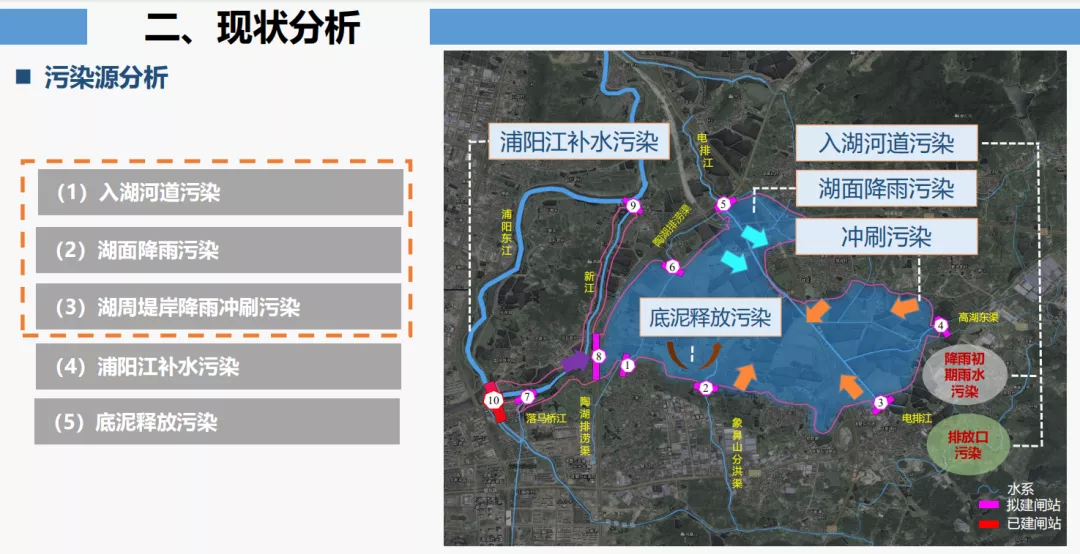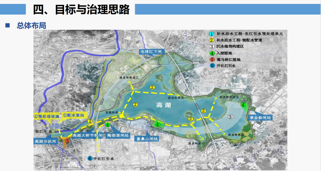 他介紹了類似問題處理的方案,如西湖與錢塘江案例。通過對(duì)比分析,他和團(tuán)隊(duì)提出了“構(gòu)建生態(tài)、美麗、健康高湖”的總目標(biāo),采用工程措施與運(yùn)行管理手段相結(jié)合的設(shè)計(jì)思路,多方面建設(shè)。