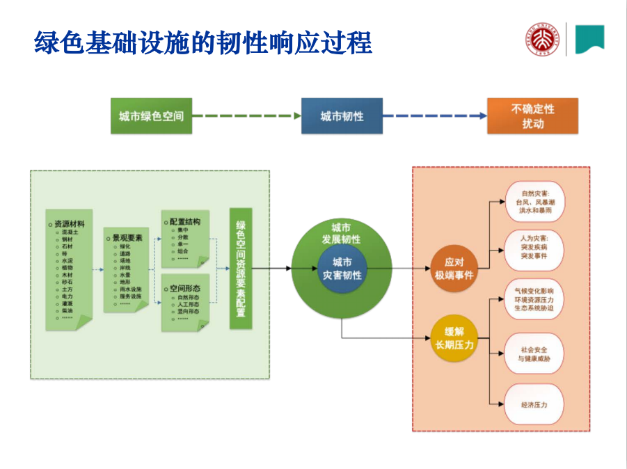 欒博在講座開始就提出,人類社會(huì)始終承受著持續(xù)的慢性壓力和偶發(fā)的急性擾動(dòng)。未來唯一確定的就是更多的不確定性。在全球城市化進(jìn)程中,城市發(fā)展也面對(duì)著內(nèi)生的不可預(yù)測(cè)性以及外界的不確定性。他認(rèn)為長(zhǎng)久以來,我們的城市都是在傳統(tǒng)工程學(xué)范式的基礎(chǔ)上構(gòu)建的,如今已經(jīng)開始失效于越來越多的不確定性?;诖?,增強(qiáng)韌性成為全球可持續(xù)發(fā)展的共識(shí)。欒博進(jìn)一步說明了何為城市韌性,同時(shí)強(qiáng)調(diào)了將藍(lán)綠空間作為潛在空間基礎(chǔ),在應(yīng)對(duì)不確定性擾動(dòng)中的重要性。同時(shí)還應(yīng)該考慮:設(shè)計(jì)范式的轉(zhuǎn)變、綠色基礎(chǔ)設(shè)施的跨尺度設(shè)計(jì)、從源頭到末端的系統(tǒng)性連接,以及資源要素配置的韌性績(jī)效等。