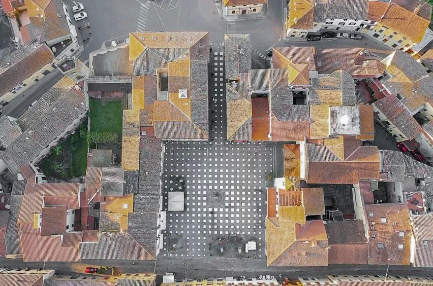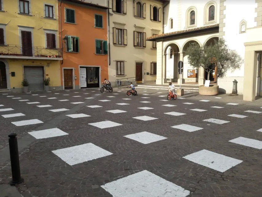 方塊網(wǎng)格之間的距離為1.8米,這正是托斯卡尼大區(qū)規(guī)定的疫情期間最小社交安全距離。網(wǎng)格的存在讓人們在穿越廣場時,能清晰地了解自己與其他人之間的距離。網(wǎng)格中的方塊大小不一,越靠近中心的方塊面積越大,帶來奇特的透視效果,還能防止人們迷失在密集的網(wǎng)格中。白色的方塊由可擦除的顏料繪制而成,疫情結(jié)束之后,廣場也將恢復(fù)原貌。