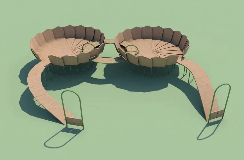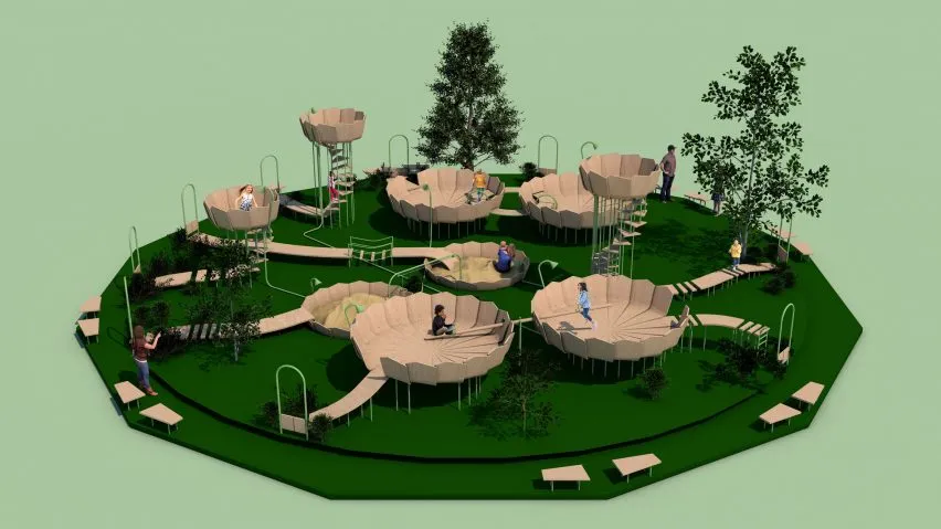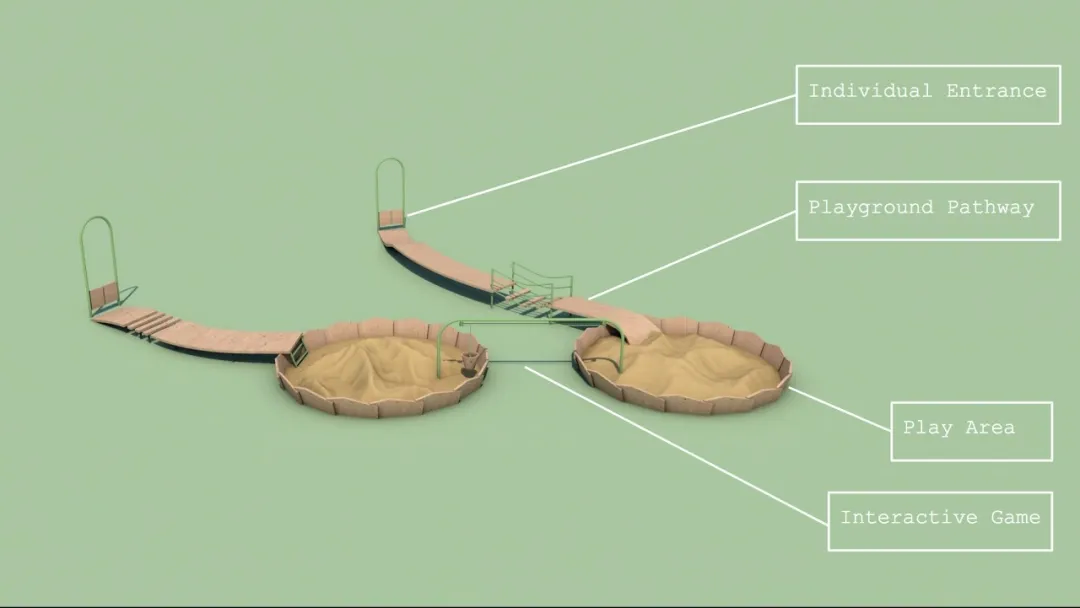 游樂場的靈感來自于亞馬遜睡蓮,蓮葉形的游戲區(qū)如同漂浮在池塘中,每個游戲區(qū)供一個孩子使用,在玩耍的同時能保持安全的距離。游戲區(qū)之間有中空的管道連接,孩子們可以通過這些管道“電話”和其他游戲區(qū)里的孩子通話。游戲區(qū)中還提供了各種各樣的游樂設(shè)施,如沙坑、蹺蹺板、爬梯、“臥式倉鼠輪”等。