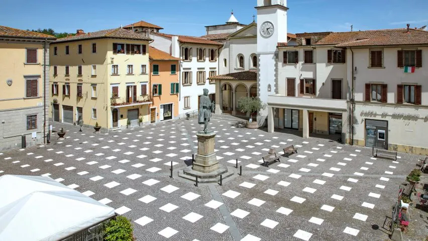 佛羅倫薩附近一座小城維吉奧的Giotto廣場上,出現(xiàn)了一系列網(wǎng)格式排布的白色方塊,它們是由意大利建筑與城市規(guī)劃事務(wù)所Caret Studio設(shè)計的裝置“StoDistante(保持距離)”。
