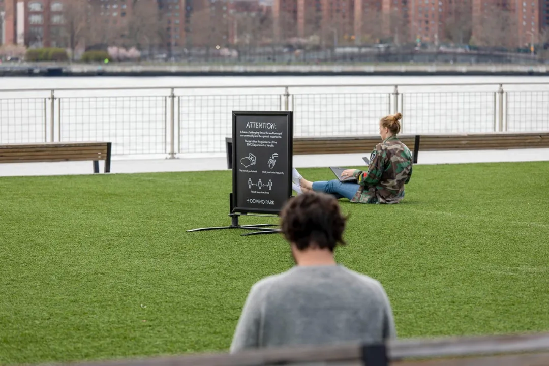 除了這些圓圈之外,Domino Park還采取了多種措施鼓勵人們安全游園,例如張貼告示提醒人們注意社交距離,警察巡邏為沒帶口罩的人發(fā)放防護用品等,在人流量較大時,關(guān)閉公園內(nèi)的主要道路等。