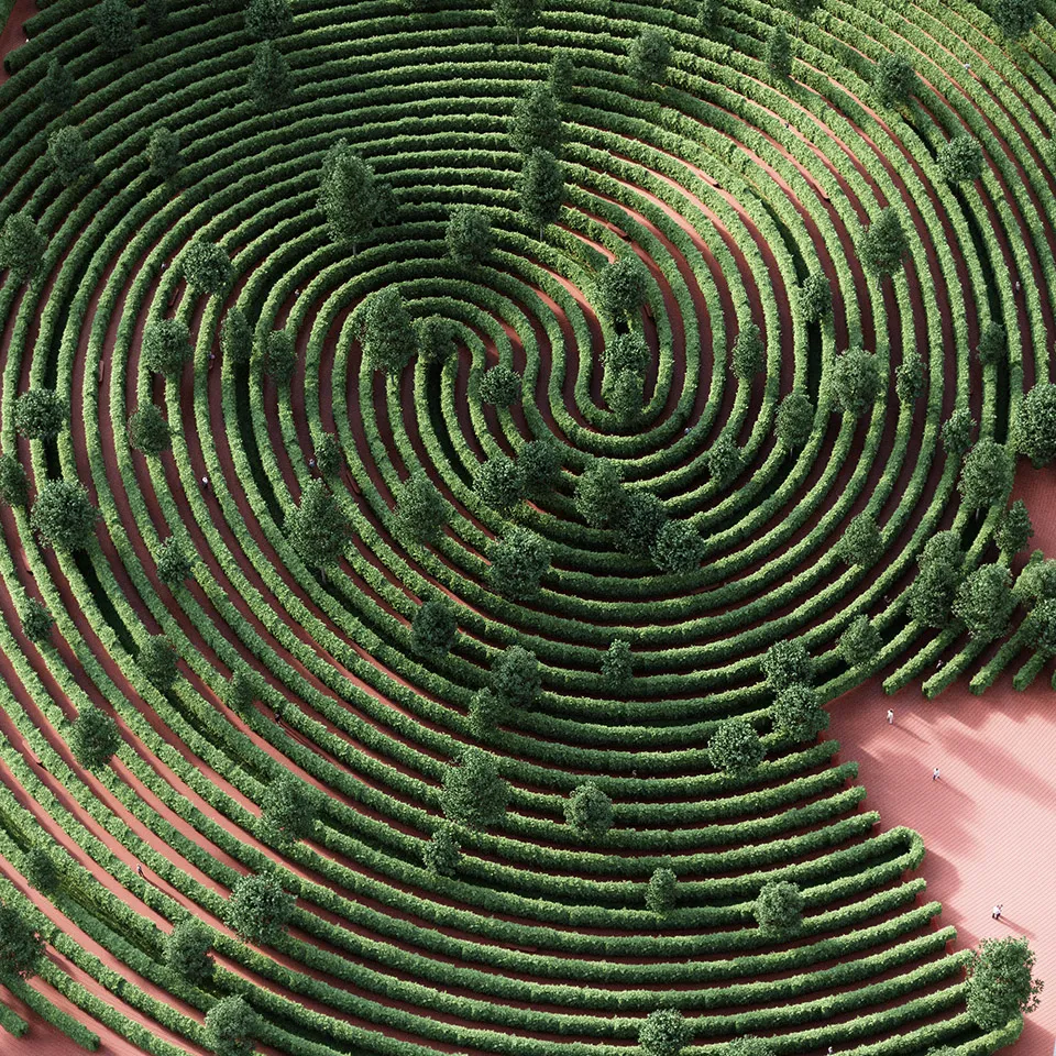 奧地利設(shè)計公司Precht事務(wù)所設(shè)計了一座迷宮一般的“距離公園(Parc de la Distance)”,這次不僅僅是在地上畫線這么簡單了,而是一個從設(shè)計之初就將安全的社交距離作為指導(dǎo)方針的公園。