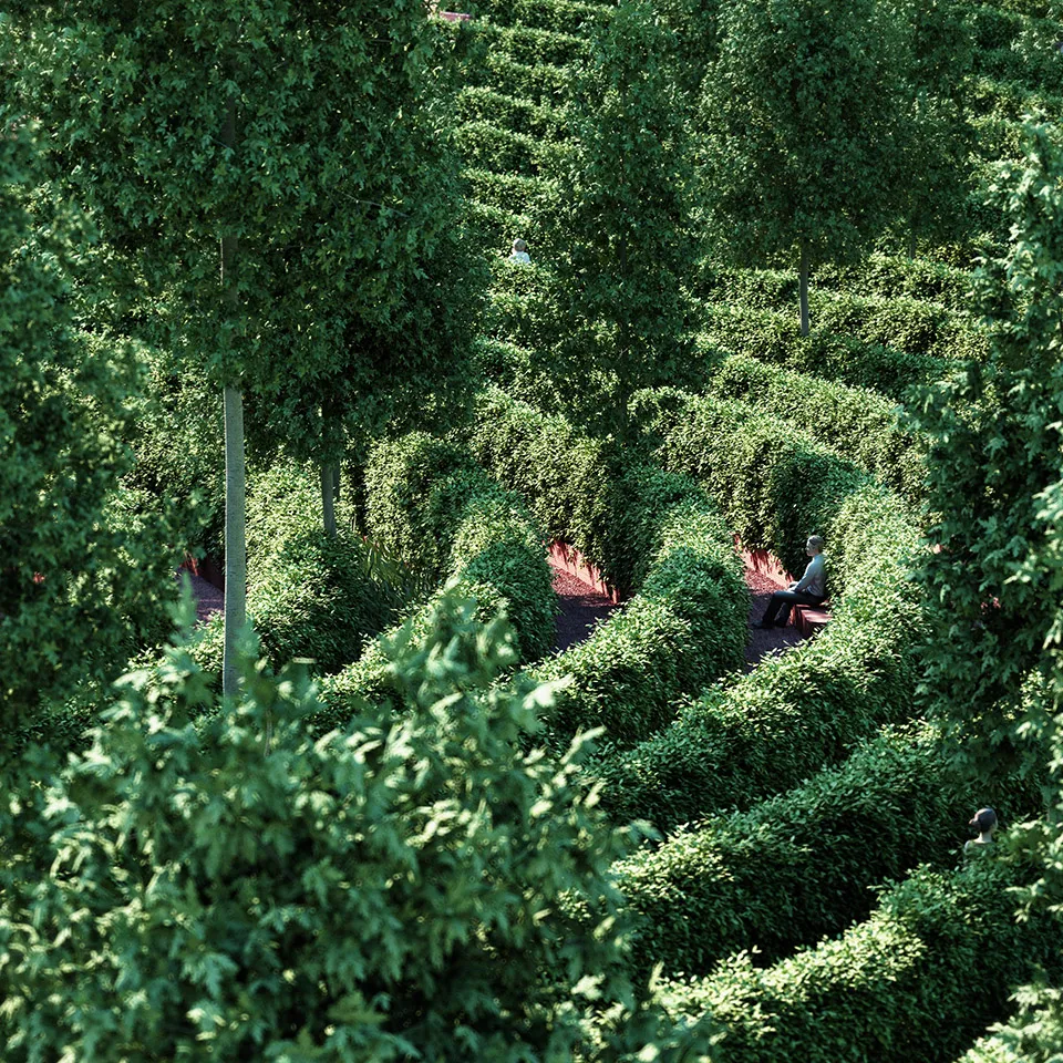 小路采用淡紅色的花崗巖碎石鋪面。各條小路之間間隔240厘米,分隔小路的樹籬高90厘米。因此在大多數(shù)情況下,盡管人們在視覺上是彼此隔離的,但仍舊能聽到附近小路上傳來的陣陣腳步聲。