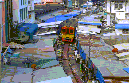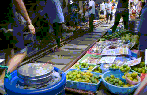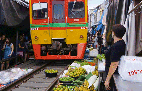 關(guān)于城市流動攤販最匪夷所思的案例當(dāng)屬泰國美功 (Maeklong) 鐵道市場。美功市場是泰國最大的農(nóng)產(chǎn)品和海鮮市場,也是被譽(yù)為世界上最危險的菜市場——市場中軸空間需每天經(jīng)歷8次火車橫穿的洗禮。