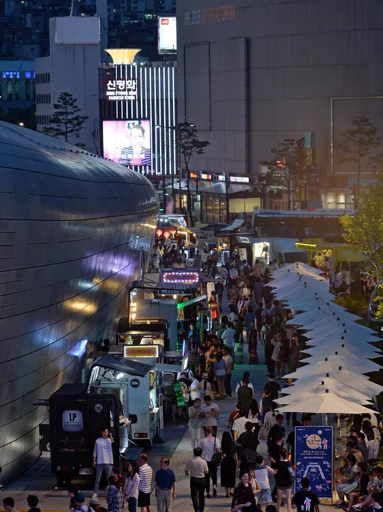 扎哈·哈蒂事務(wù)所設(shè)計的新東大門設(shè)計廣場旁的夜市。圖源:news1