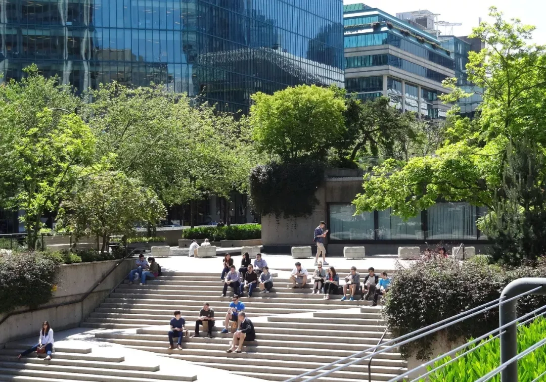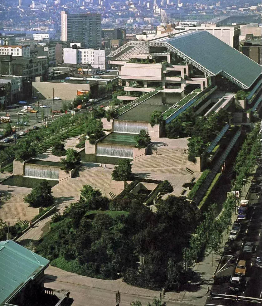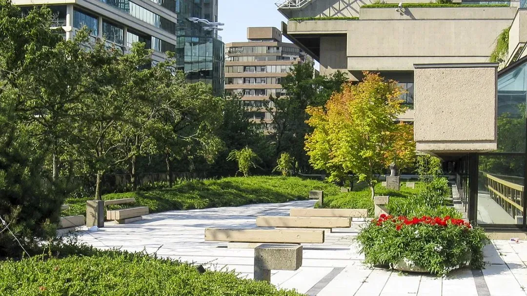 該廣場是溫哥華的公民核心和主要公共空間,是一個連續(xù)的屋頂花園,具有封閉式和開放式空間。屋頂花園被概念化為城市綠洲,從埃里克森設計的法院大樓到溫哥華美術館(Vancouver Art Gallery)延伸了三個街區(qū),將結構與景觀融為一體,遍及各個樓層和地下的民用建筑群??蛇M入式綠色屋頂在延緩雨洪徑流的同時降低了熱島效應。