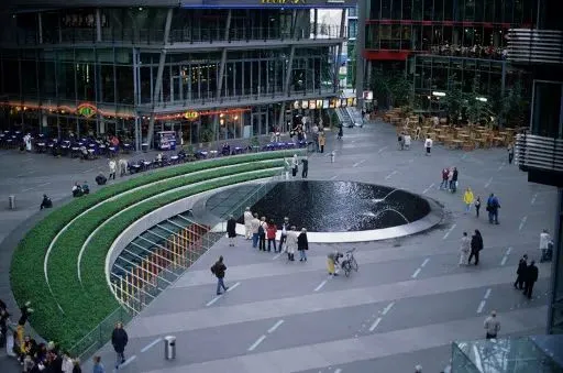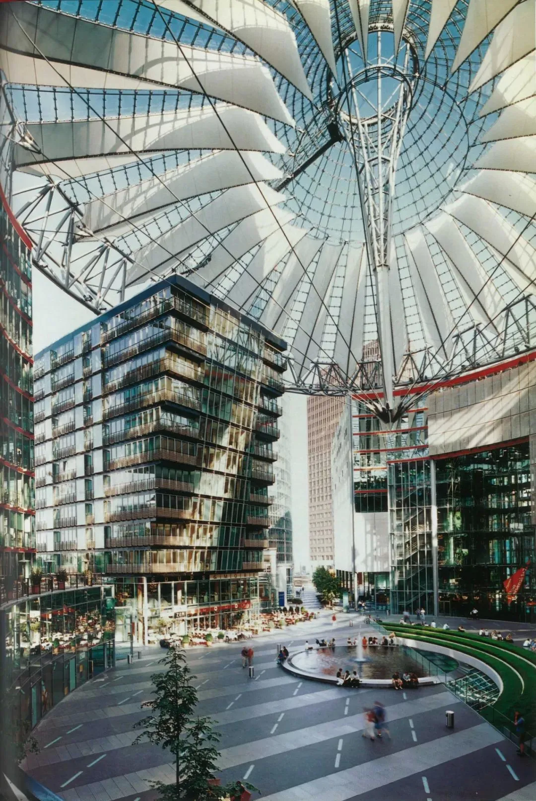 索尼中心位于德國柏林市中心的波茨坦廣場,是整個廣場改造的一部分。彼得.沃克以極少的設計語言創(chuàng)造出豐富多彩的公共空間,整體設計現(xiàn)代、簡約、干凈而不失親切感。設計巧妙地結合采光天窗布置了聚合感強烈的圓形水景,形成中心廣場的焦點景觀。在形式上,采用極簡的構圖形式,優(yōu)雅的美感。通過玻璃、金屬材料、石材和植物等細部材料的巧妙組合和銜接,使項目達到了很強的現(xiàn)代感并與建筑相呼應。