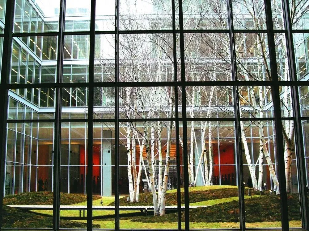 設計師通過用玻璃鋼鐵綜合設施所圍繞而成的空間,向人們展示了一個種植著樺樹和青苔的別致的樓內露天花園庭院。占地約僅7平方米的方形庭院默默地依偎在宏偉的總部大樓主體建筑腳下,與大樓的建筑各種建筑設計元素相互搭襯,卻顯得那樣的和諧、自然。乍看之下,在四周透明玻璃圍墻的包圍之中,人們容易產(chǎn)生一種十分微妙的感官錯覺,彷佛這個花園是一個獨立的景觀庭院。