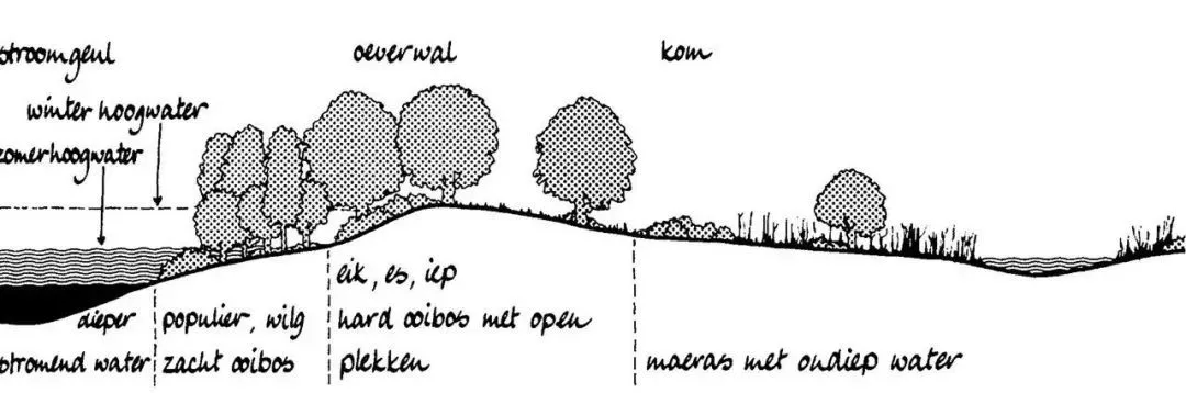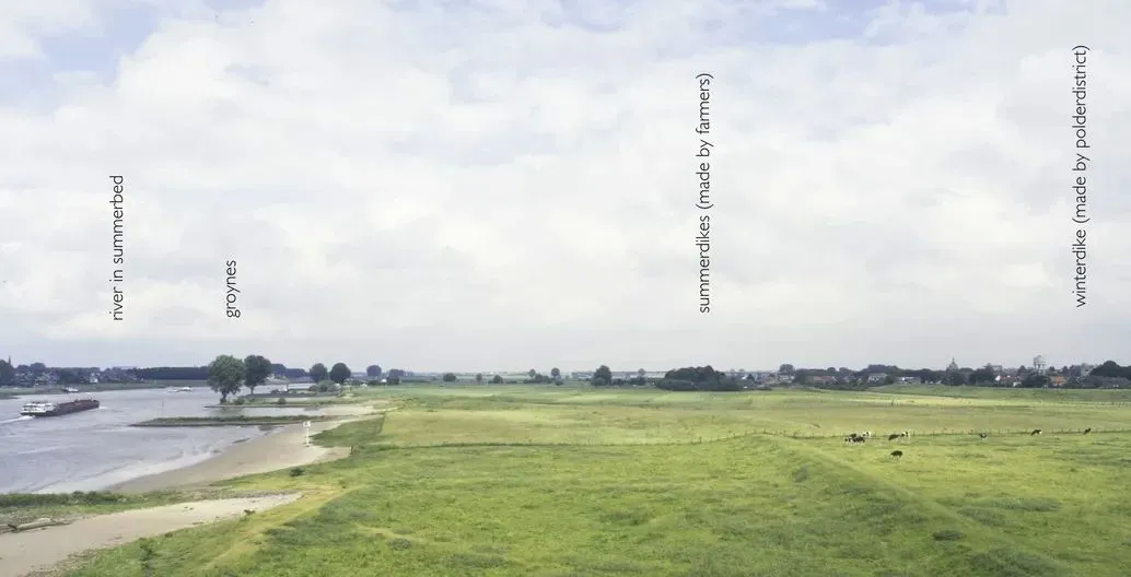 規(guī)劃允許河流在夏冬堤之間的土地上周期性泛濫,并使意料之外的使用成為可能,這種還地于河的思想是對荷蘭千百年圩田傳統(tǒng)的生態(tài)性反思。另一方面,河流之間的土地則作為農(nóng)業(yè)生產(chǎn)使用,使現(xiàn)存農(nóng)場也能夠繼續(xù)運作,并根據(jù)水位的波動讓農(nóng)場自行管理地表水以滿足特定使用,由此建立一個富有彈性的土地使用框架。
