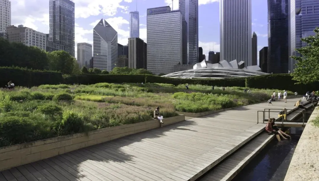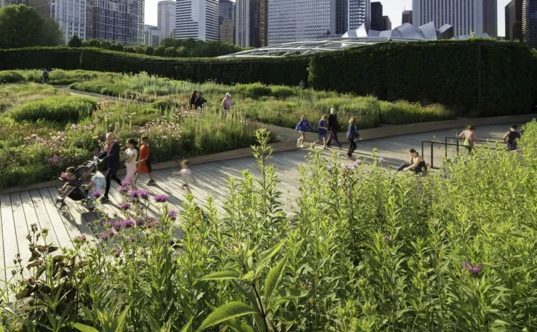 盧瑞花園是一座面積3hm2的屋頂花園,位于芝加哥市中心千禧公園內。該花園不僅表現(xiàn)了芝加哥獨特額城市景觀,那種大膽的當代標志性風格,還為城市居民和野生動物提供了安靜的休憩場所。景觀設計彰顯了芝加哥城和花園所在地高速發(fā)展的立體組合型城市景觀,榮獲2008年ASLA通用設計類榮譽獎。