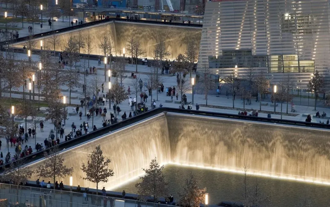 該設計傳達了希望和更新的精神,創(chuàng)造了一個沉迷的空間,與繁華的大都市的通常景點和聲音分開。方案占地32368 平方米,將雙子塔留下的大坑建成6 米深、各占地4000 平方米的方形水池,其四周的人工瀑布最終匯入池中央的深淵。用四起的水聲遮蔽鬧市區(qū)的喧囂,而瀑布則能過濾外部強烈的光線。