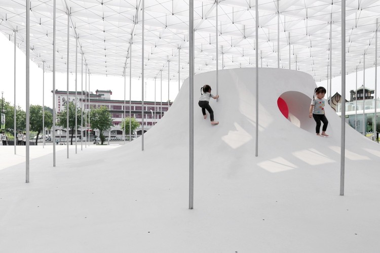 整組空間由“劇場”、“展場”、“趣場”組成,融合了社區(qū)活動、藝術(shù)表演、親子游戲等功能,吸引人們參與,在冬日中激發(fā)出街區(qū)的熱情活力。從空中望去,它仿佛一片潔白輕盈的“三角之洲”,成為這個城市江邊的“引力場”。