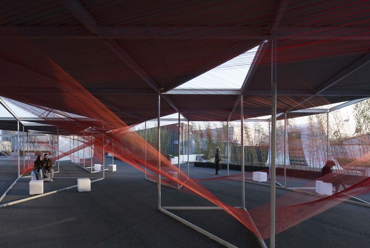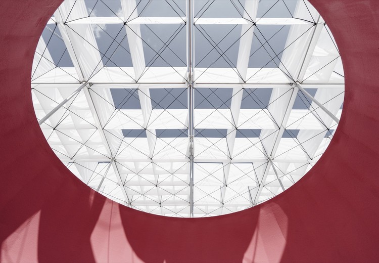 為了回應(yīng)基地自然之力,”浮光之間“的概念取自風(fēng)與光的特殊狀態(tài),將風(fēng)箏天棚與曲面島嶼作上下系結(jié),從而構(gòu)筑出一座漂浮在廣場上,捕風(fēng)捉光的亭子。建筑師希望可以借著風(fēng)箏與自然相互作用,引導(dǎo)人們用新的方式去感覺空間,讓廣場成為匯聚人的注目與駐足、柔軟而具公共性的場域。