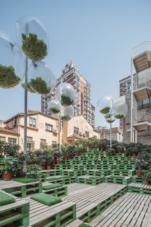 庭院上空,漂浮著裝有斑斕樹葉的氣球容器,斑駁的樹影柔和灑落。花草植被 參差于各個模塊之間,生長、綻放,將寬闊開廣的平臺裝點(diǎn)成引人入勝的花園。