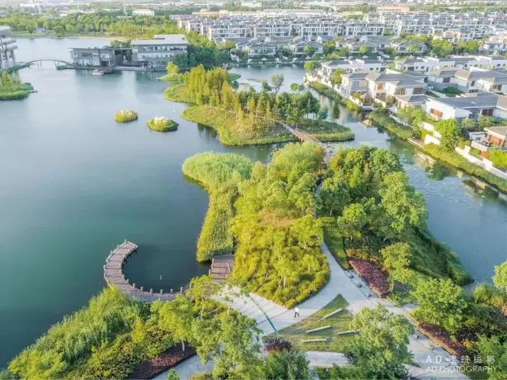 水月周莊為周莊首個大型旅游度假綜合體,項目包含旅游度假、文化藝術、商業(yè)、會議、居住、濕地公園等功能。其中,以島嶼群的形式縈繞在水上的濕地公園,集休閑、生態(tài)、文化和現(xiàn)代等特色于一體,既是改善場地水質的生態(tài)過濾器,也是城市新的開放綠地空間。