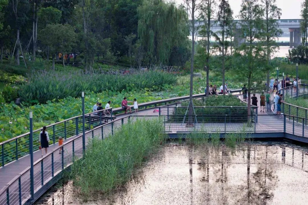 設計團隊依據(jù)濕地公園水生態(tài)系統(tǒng)的自然凈化能力來恢復水體的自然面貌,將凈化水質與創(chuàng)造豐富的景觀環(huán)境結合起來,打造一個人與自然和諧共處的環(huán)境。在技術層面,濕地中種植的植物、動物和微生物通過物理過濾、化學降解和生物吸收等多種作用機制,將水中的污染物和有毒物質吸收、分解或轉化。水生態(tài)系統(tǒng)的建立,最終使?jié)竦厮w得到凈化。