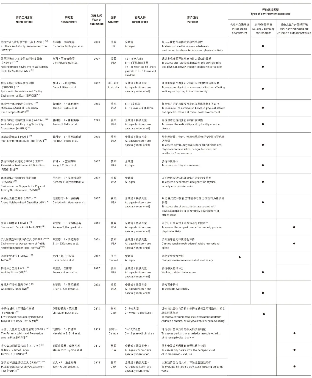 18項(xiàng)評(píng)價(jià)工具基本信息匯總?cè)绫?所示。其中提及兒童群體或包含兒童群體相關(guān)具體指標(biāo)的有14項(xiàng),其中完全面向兒童群體的僅有NEWS-Y、MAPS、EWI&MI,以及PARK4項(xiàng)。評(píng)價(jià)工具涉及三類(lèi)環(huán)境:1)機(jī)動(dòng)車(chē)交通環(huán)境;2)步行/騎行環(huán)境;3)其他兒童戶(hù)外活動(dòng)環(huán)境。