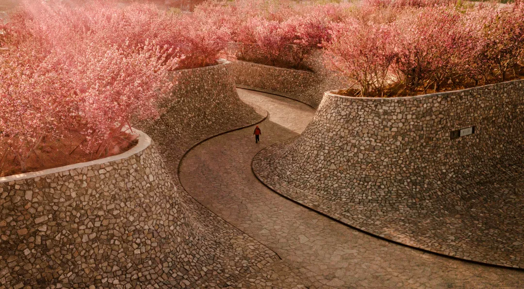 我第一次現(xiàn)場就被徹底征服了,而且每次去每次感受不同……野性,原始,生命,血液,不一而足。在做這個方案時候,我讓自己平靜了許久,拋開腦海里的過往經(jīng)驗,撇去眼前浮現(xiàn)的各種時尚和藝術(shù)……往下沉,往下沉,一直沉到只有了這片土地的時候一種材料,一種語言,一氣呵成,感情復(fù)雜,情緒多變……所有與項目相關(guān)的風(fēng)格、主題、材料、手法甚至是工匠都來自項目周邊:遠(yuǎn)山的呼應(yīng),毛石的齟齬,櫻花的綻放,這里不僅對場地各種資源的關(guān)系重塑,更是用煙火氣重塑了載承其間的生活——看似只一處過度空間的主入口卻有著生活劇場的多義性,借此實現(xiàn)睦鄰友好的社區(qū)關(guān)系建構(gòu)。