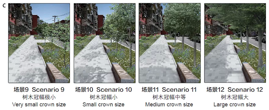 研究以相關(guān)調(diào)查為參考[17],將植物豐富度、綠地率、植物生長(zhǎng)階段(以樹(shù)木冠幅大小表示)、種植方式,以及設(shè)施類型這5類環(huán)境要素作為本次研究的定性自變量進(jìn)行分析[18]。